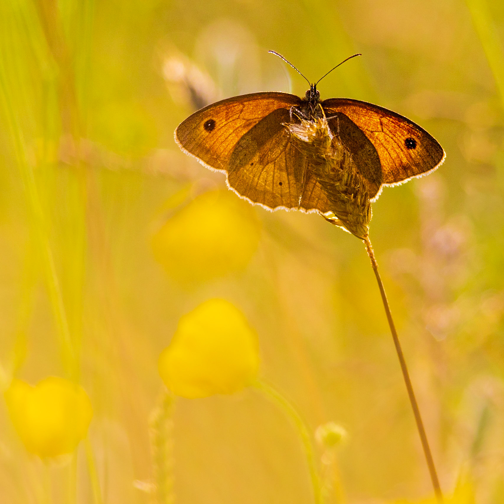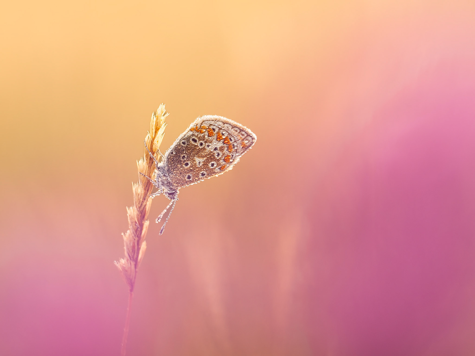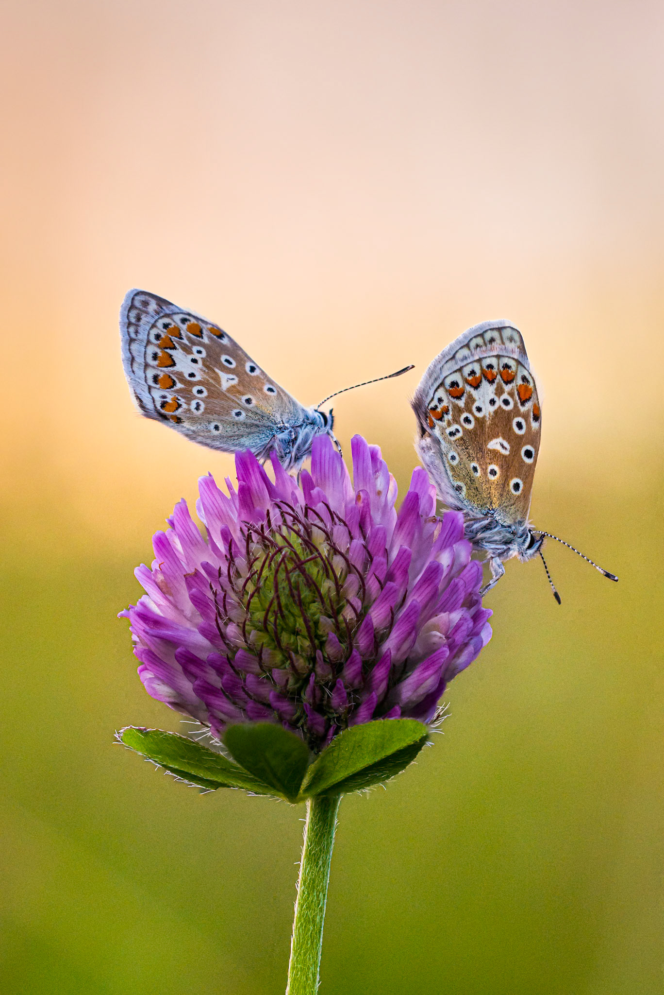 Two symmetrical Common Blue butterflies on a dried flower stem with a golden backlit field as a background
